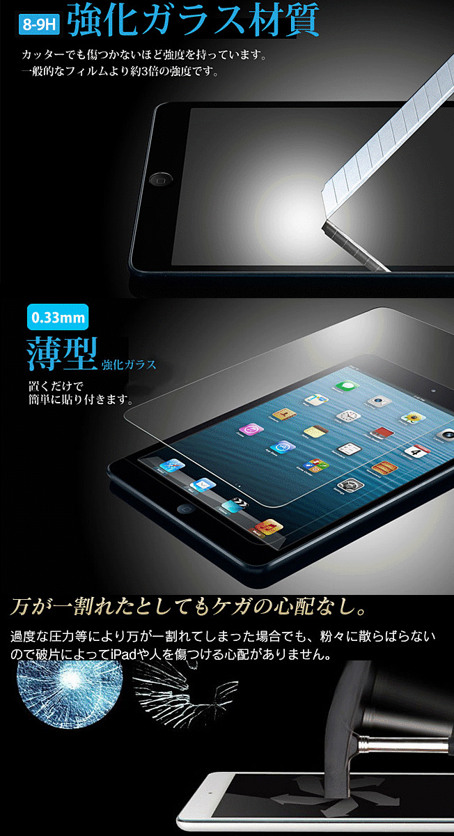 厚み 0.26mm 対応機種 ・iPad mini1(第1世代) ・iPad mini2(第2世代) ・iPad mini3(第3世代) ・iPad air1(第1世代) ・iPad air2(第2世代) セット内容 ガラスフィルム、クリーナー(ウェット)、クリーナー(ドライ)、埃除去シール 備考 ※曲げる力には大変弱いので貼り付け・剥がす際はなるべく湾曲させないで下さい。
